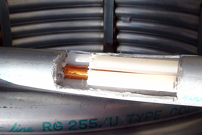 The actual delay line, called “Spir-o-line”, was not manufactured by Tektronix. It was called Spir-o-line because the large center conductor (about the size of a pencil) was held inside the line with four polyethylene tubes (largely air) as seen in this photo. Printed on the outside of the delay line is "Prodelin CAT. 61-875 7/8 (50) Spir-O-line RG55/U TYPE CODE 94661".