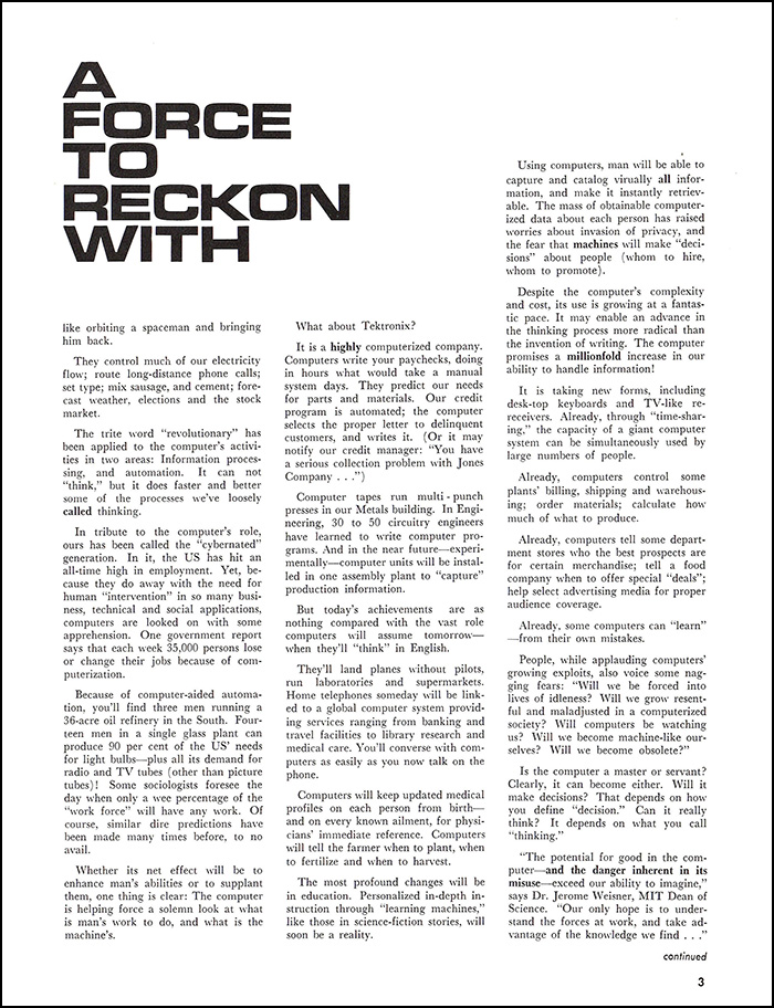 The Fall 1966 TekTalk had a 9 page article on computers at Tektronix with some future forecasts. In the 10 years prior the the installed base of computers grew from several hundred to over 30,000. This article has been extracted from the TekTalk. Click on the image to view the PDF.