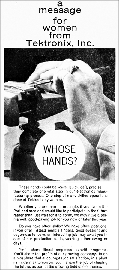 The March Advertisement of the Month comes from the January 18, 1962 Oregonian. This advertisement calls for women to apply for both office and production jobs at Tektronix. For the positions in manufacturing, women possessing “nimble fingers, good eyesight and eagerness to learn” could find an interesting job in a production unit.