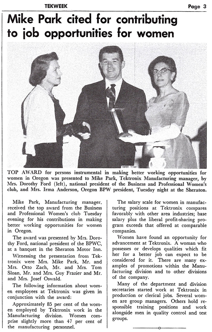 This was not new concept at Tektronix. A March 12, 1965 TekWeek article reported how Mike Park, Tektronix Manufacturing Manager, was recognized by the Business and Professional Women’s Club for his contributions in creating better working conditions for women in Oregon. At the time 85% of women employed at Tektronix worked in the Manufacturing Division and slightly more than 47% of all employees in that group were women.