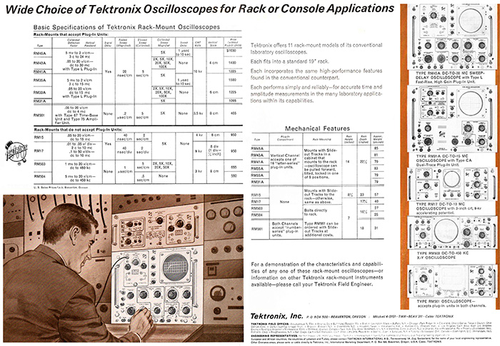The April Advertisement of the Month comes from the February 15, 1962 issue of Electronic Design. To complement the February Photo of the Month where Lucille Ball was intimidated by a computer incorporating a Tek RM35A/45A oscilloscope, we present an advertisement titled “Wide Choice of Tektronix Oscilloscopes for Rack or Console Applications”, It summarizes the 11 oscilloscopes that made up Tek’s 19-inch rack mount line at the time. At the high end priced at $1,650 ($17,900 in 2026 dollars), the plugin-capable RM45A is featured at 30 MHz. The bandwidth for the RM503 and RM504 is 450 KHz. Both depictions of the RM45A show the Type L plugin. Mounted above the RM45A in the lower left corner is a Type 127 Preamplifier Power supply with a Type CA and Type L plug-in. Click on the image to view the PDF.