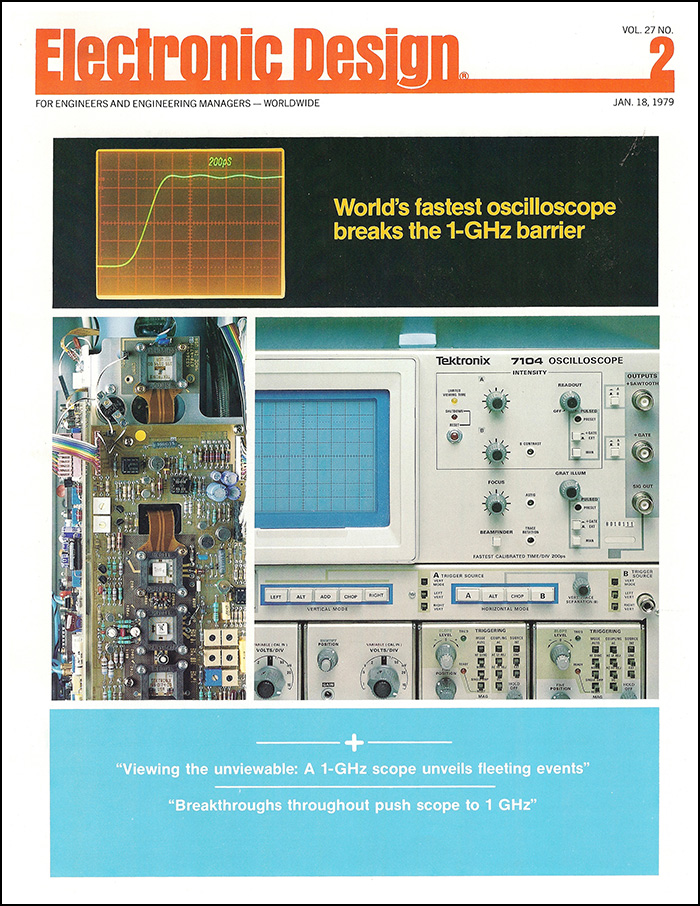 With the recent donation by Chris Curtin of the cutaway 7104 micro-channel-plate CRT, I made a call for 7104/mcp information via ex-Tek gateslist, and John Addis immediately responded with a pointer to the Electronic Design January 18, 1979 article by Hans Springer. There are some very descriptive figures and explanations of the challenges included in the article. Click on the image below to open the PDF.