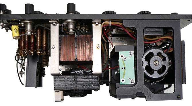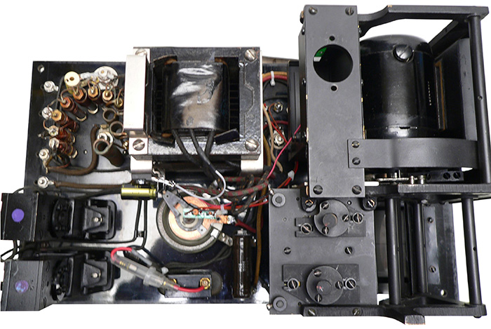 Above the power transformer you can see the precision wire wound resistors for the voltage divider string. Off to one side of these are the heavy gauge wire wound resistors for the current divider string. You can see a new adjustable position PCB with white LED mounted underneath. What you can’t see is the lens it shines through to adjustable mirrored prisms. The light then passes through two rectangular slots and out to the galvanometers. The galvanometer mirrors are suspended by two less than .001” silver wires. This tiny adjustable complex mechanical suspension is immersed in a dampening silicone oil and flanked between magnets. The screen light output is very dim due to inefficiency of the galvanometers.
