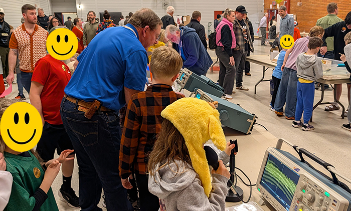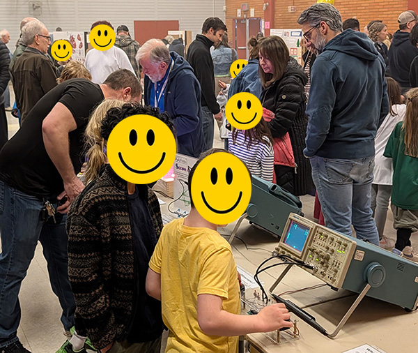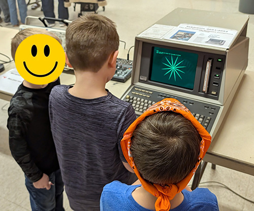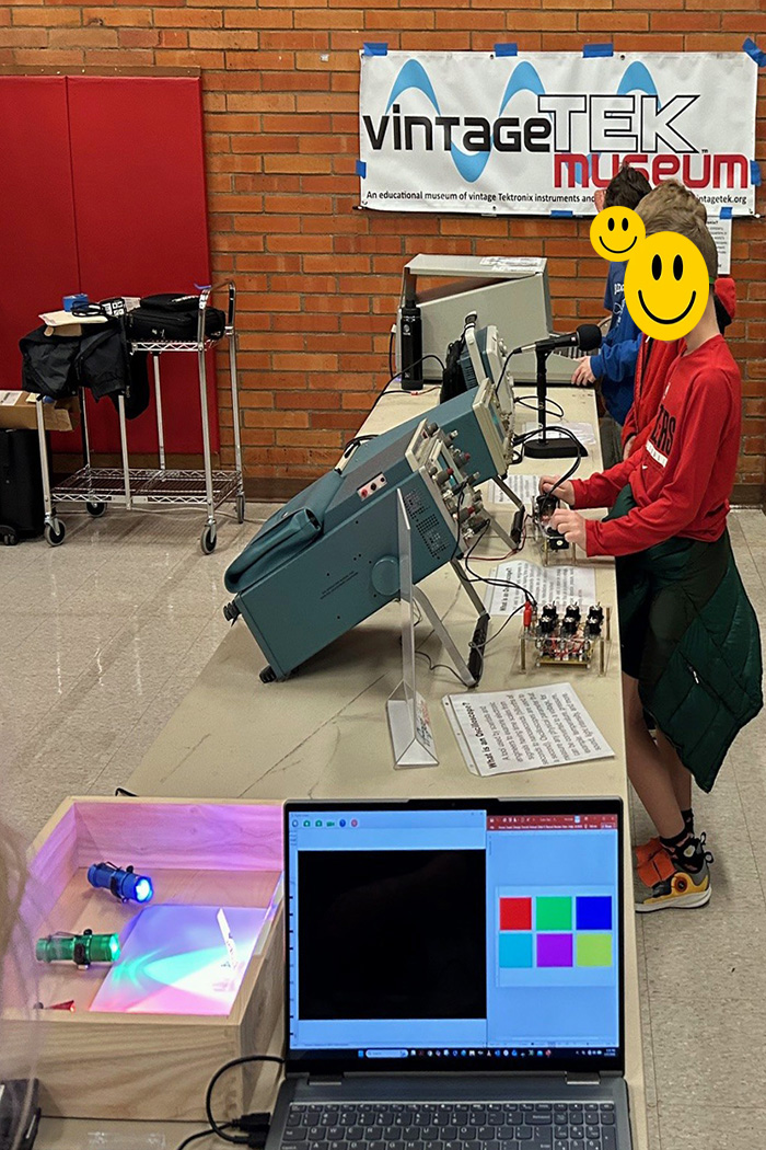 The vintageTEK museum had an exhibit at the 2026 Ridgewood Elementary Science Fair. Our exhibit table was on the main concourse which provided a lot of traffic. Students began engaging the exhibit before the science fair opened. Our exhibit consisted of our color and microscope demonstration, Scope Artist, Demo Board exhibit, microphone and oscilloscope to see your voice, and the 4052 Instant Art program. Volunteers were Dave Brown, Pat Green, and Gary Johnson. This photo shows our exhibit with some students prior to the science fair opening.