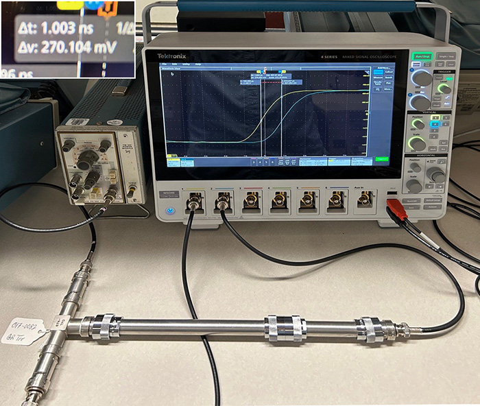 A signal from the PG 502 pulse generator is split and routed to two paths identical in construction with one 30 cm longer than the other. This extra 30 cm is an “airline” and used because the dielectric properties of air are very close to those of a vacuum.