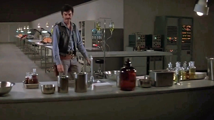 The 1981 movie The Last Chase features a pair of Tektronix 400 series portable oscilloscopes. Only one is visible in this scene. The other is just barely visible at the left edge.