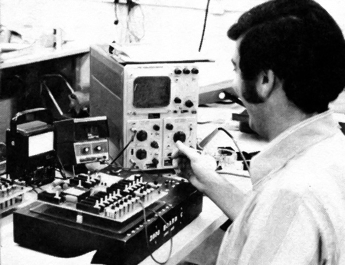 This photo is of Bill Bores at ARP testing an Odyssey synthesizer PCB with a Type 561B oscilloscope with 3A6 and 2B67 plug-ins. ARP Instruments, Inc. was a Lexington, Massachusetts manufacturer of electronic musical instruments, founded by Alan Robert Pearlman in 1969.
