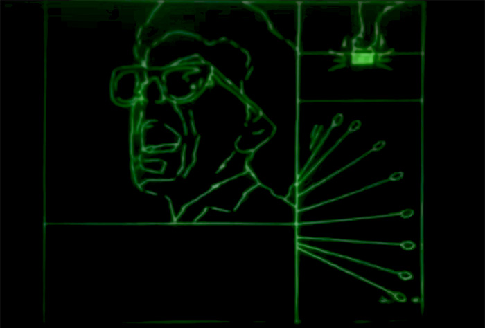 This photo shows a scene at the end of the music video Accidents Will Happen by Elvis Costello & The Attractions, released in 1979. It is drawn and then rotated several times. No description is given for the display but appears to be a DVST.