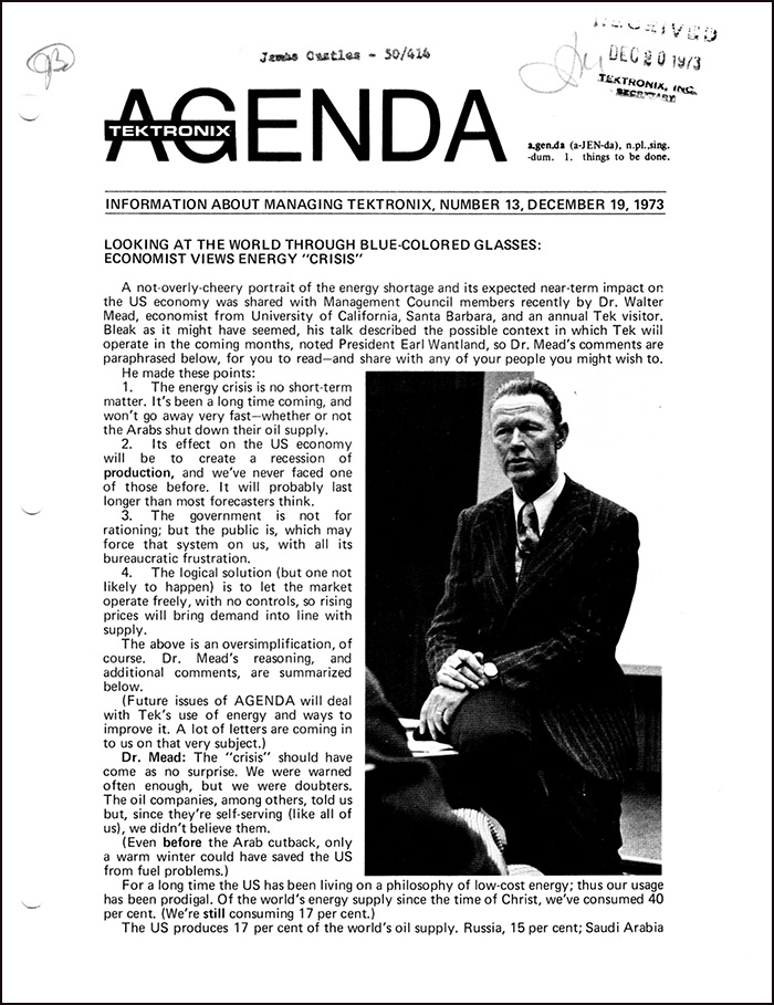 Agenda was a regular publication for Tektronix managers with information about the company. This issue is from December 19, 1973. The first few pages highlight the world economy and the energy crisis. 50 years later, it still seems quite relevant. Click on the image to view the PDF.